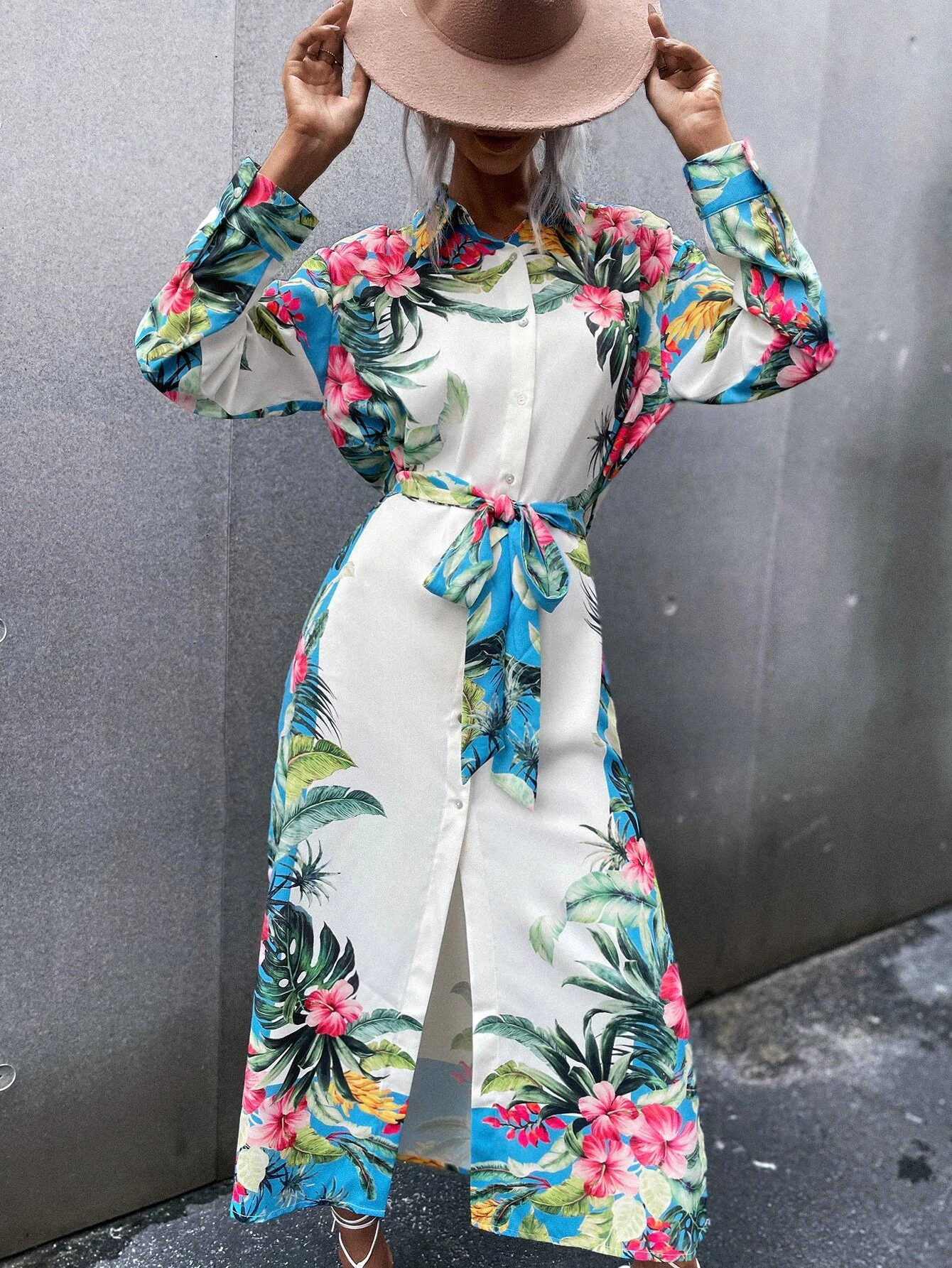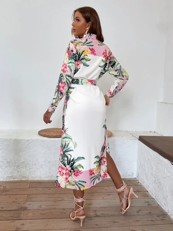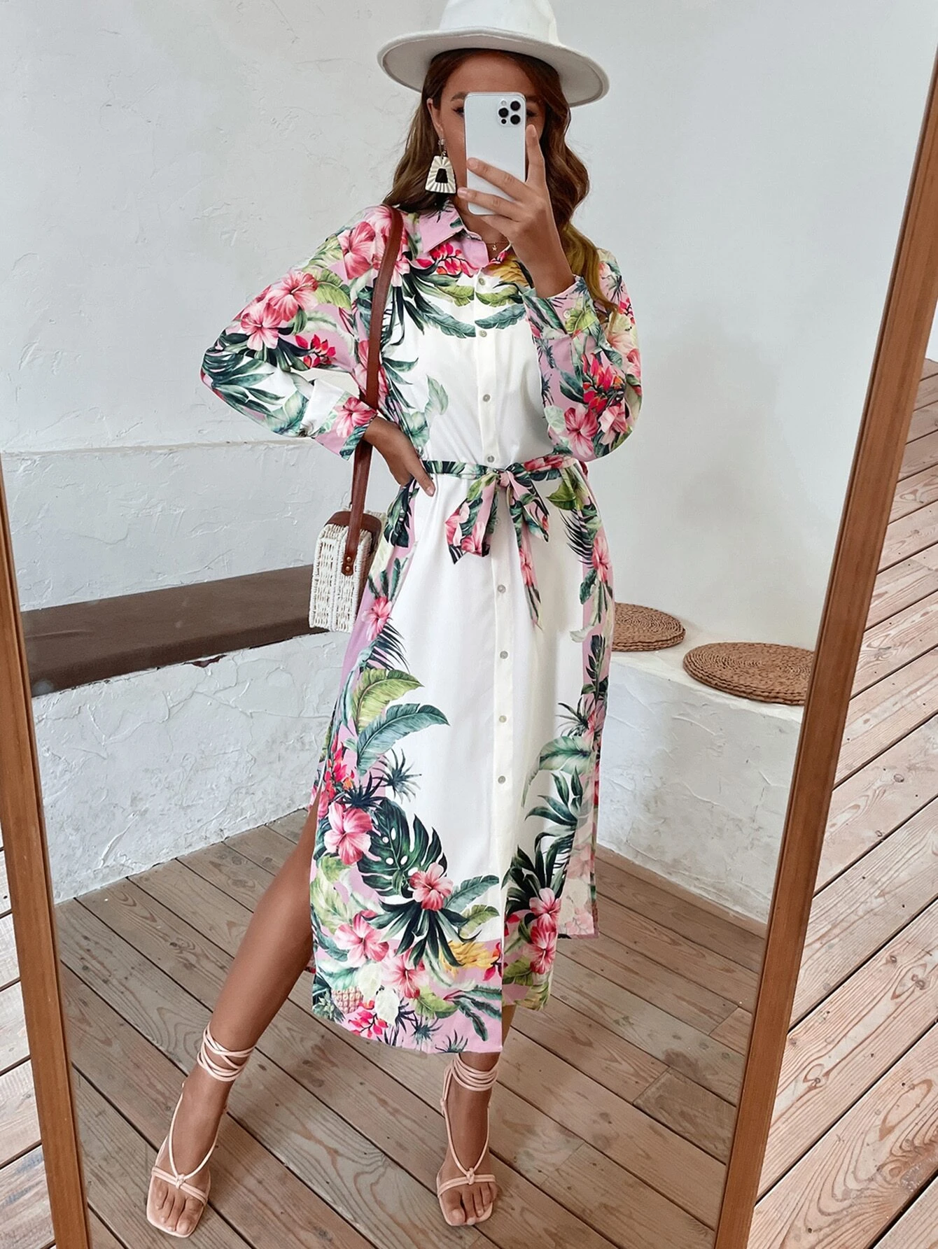 Oya Floral Print Button Front Split Hem Dress With Belt