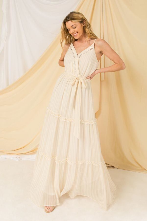 A woven maxi dress featuring surplice neckline, shoulder straps, elasticized waist with self sash belt and tiered skirt