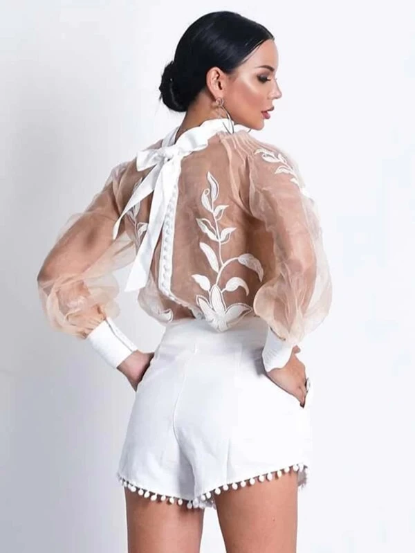 Details: Sheer, Contrast Lace, Button, Pocket, Tie Back
