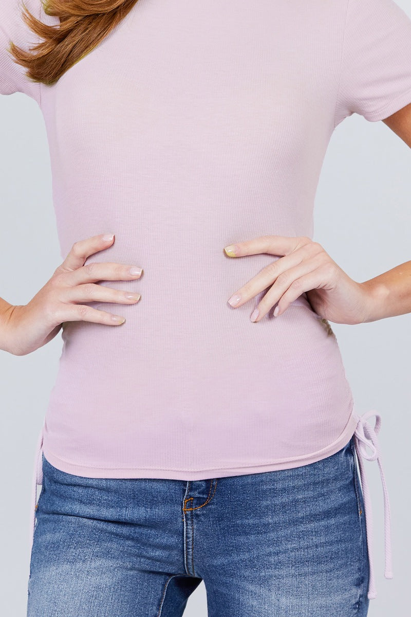 Short Sleeve Mock Neck Side Shirring Detail Rib Knit Top
