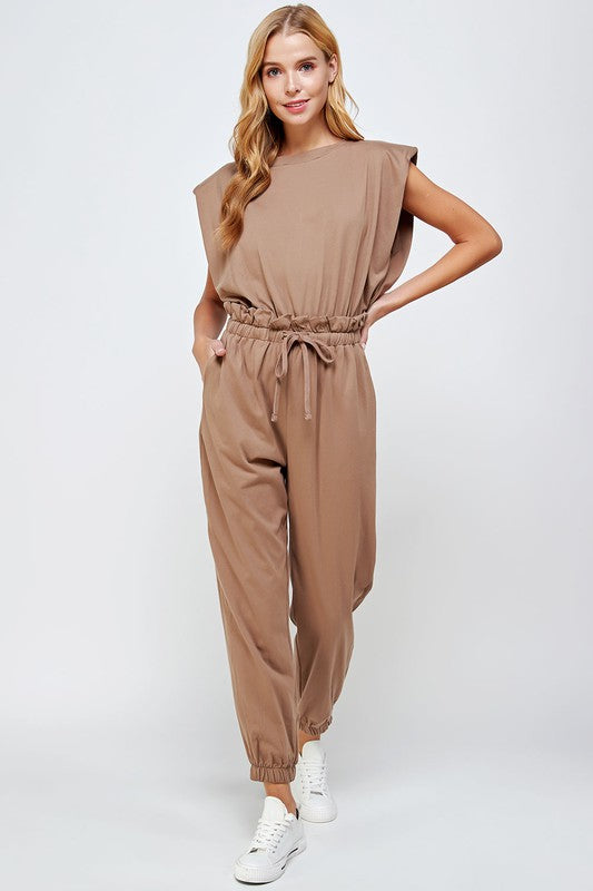 Shoulder padded muscle sleeveless jogging jumpsuit in 100% cotton fabric.