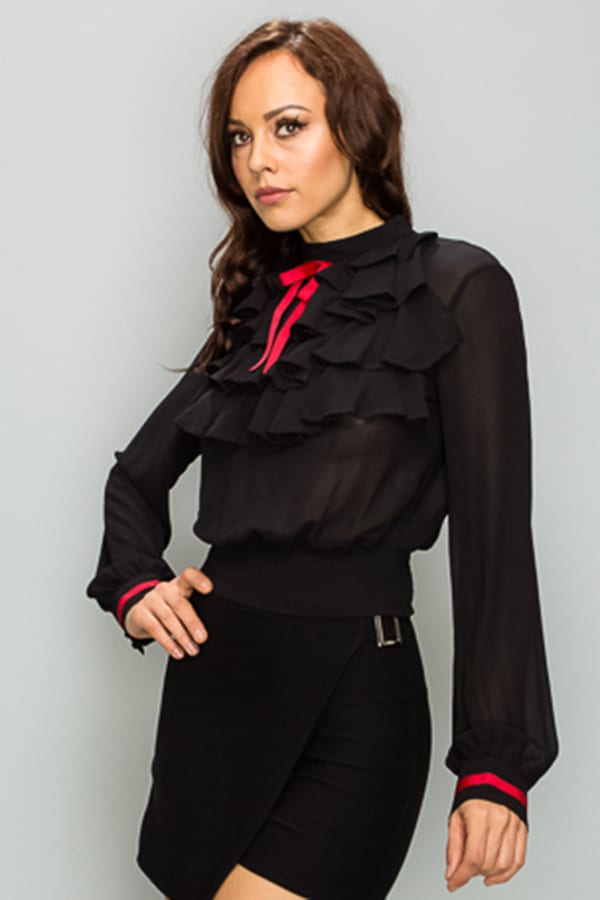 RUFFLED BLOUSE WITH ACCENT STRIPES ON THE CUFF.